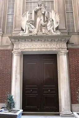 The Church of Our Lady of Victory, also known as the War Memorial Church,[2] is a Roman Catholic parish church in the Roman Catholic Archdiocese of New York, located at 60 William Street on the northeast corner of William Street and Pine Street in the Financial District of Manhattan, New York City. It was established in 1944, during World War II, by Francis Cardinal Spellman, Archbishop of New York and Apostolic Vicar for the U.S. Armed Forces from December 11, 1939 to December 2, 1967, at a time when "victory in the war was in sight but not yet assured."[4] A quote from Cardinal Spellman greets worshipers at the front door: "This Holy Shrine is dedicated to Our Lady of Victory in Thanksgiving for Victory won by our valiant dead, our soldier’s blood, our country’s tears, shed to defend men’s rights and win back men’s hearts to God."[2][3]