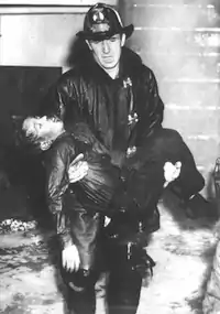 The December 16, 1958, issue of Life Magazine printed a major article about the fire, containing many pictures and reconstructed drawings of the classrooms. The first page of the article featured an image of firefighter Richard Scheidt carrying the body of 10-year-old John Michael Jajkowski, Jr. from the building. The photograph of Jajkowski, a fifth grader in Room 212, later served as a fire prevention safety poster nationwide. Jajkowski, an accomplished musician, played the accordion and served as a church choir member, and had expressed a desire to become a priest.[12] Like 25 of his other classmates, John was suffocated by black, oily smoke.[13] Steve Lasker took the photograph of Scheidt and John as the fire department was beginning to achieve control over the fire.[14]