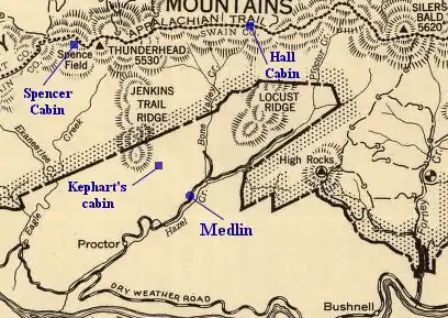 Part of Our Southern Highlanders takes place atop the main crest of the Western Smokies between Gregory Bald and Silers Bald, which at the time was coated by a series of highland meadows used as livestock pastures during the growing season when bottomlands were needed for crops. Each pasture had a respective cabin for its summertime herdsman, namely (from west to east) the Russell cabin at what is now Russell Field, the Spencer cabin at what is now Spence Field, Hall cabin atop what is now Big Chestnut Bald (in the vicinity of the modern Derrick Knob shelter), and a cabin at Siler's Meadow (just off the summit of Silers Bald).[5][6] The Hall cabin mentioned often by Kephart should not be confused with the Hall cabin presently located at the end of the Bone Valley Trail, although both were built by Jesse "Crate" Hall.[7]