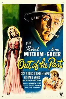Out of the Past (billed in the United Kingdom as Build My Gallows High) is a 1947 film noir directed by Jacques Tourneur and starring Robert Mitchum, Jane Greer, and Kirk Douglas. The film was adapted by Daniel Mainwaring (using the pseudonym Geoffrey Homes) from his 1946 novel Build My Gallows High (also written as Homes),[1] with uncredited revisions by Frank Fenton and James M. Cain.