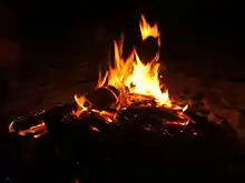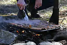 Backwoods cooking is a method of cooking without the use of kitchen implements.[4] It commonly takes place in the backwoods, often in combination with wild or conventional camping. Some variants of backwoods cooking allow the use of items of cookware such as a cooking pot;[5] however there are many recipes without any. Some backwoods alternatives to cookware include: aluminium foil,[4] fruit skins[6] and heated stones.[7] Traditionally backwoods cooking takes place over a wood-burning fire because wood is the most available fuel source in the backwoods.[8] As a result, some recipes include information about the intensity of the fire to be used.[6]