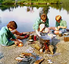 Backwoods cooking is widely practiced within the Scouting movement. While it is most associated with scouting today, the term "backwoods cooking" pre-dates Scouting by at least 25 years.[9] Within scouting it may also be known as "lightweight cooking," which may also have a focus on using aluminium foil for cookware for much lighter weight cooking.[10]