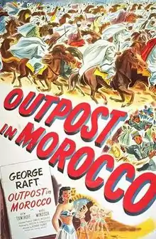 Outpost in Morocco is a 1949 action adventure film directed by Robert Florey, starring George Raft and Marie Windsor. Paul Gerard (George Raft), a Moroccan Spahi officer and his French Foreign Legion garrison, holds off attacks from the native tribes of the Emir of Bel-Rashad (Eduard Franz), the father of Cara (Marie Windsor), the woman he loves.[1] As a rarity amongst American films of the Foreign Legion genre, the Legion cooperated with the producers. A second unit led by Robert Rossen filmed scenes in Morocco.[2] Some of the large-scale action scenes of the film were reused in Fort Algiers and Legion of the Doomed.