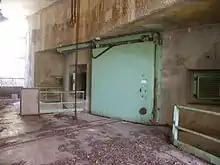 After deactivation in 1967, Rochonvillers was renovated in 1980 as the French First Army's hardened command center. Work included replacement of the ventilation and filtration system and construction of a blast wall a short distance in front of the main entry. The installation was planned to house 500 people for an extended period, immune to the effects of electromagnetic pulse, radioactivity, chemical weapons and all but a direct hit with a nuclear weapon. The electrical generating plant and underground barracks were renovated. Most exposed concrete faces in the entry blocks were covered with earth as a blast shield,[10] while the combat blocks themselves were used only as antenna mounts. The peacetime 1st Army headquarters was moved from Strasbourg to Metz in 1989, in part to be closer to Rochonvillers.[43] From 1981 to 1998 the command center was maintained by a small staff in between full-scale exercises. With the disappearance of the Soviet threat, the command center was deactivated.[37]