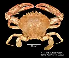 Ovalipes ocellatus, known as the lady crab, is a species of crab from eastern North America.[1] Other names for it include the leopard crab or Atlantic leoplard crab due to the leopard-like rosette patterns on its shell, the calico crab (not to be confused with Hepatus epheliticus), or ocellated crab.[3] It has a shell 3 in (7.6 cm) long and only slightly wider, which is covered in clusters of purple spots. It occurs from Canada to Georgia, and lives mainly on molluscs, such as the Atlantic surf clam.