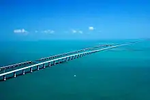 Portions of the road were tolled until April 15, 1954; toll booths were located on Big Pine Key and Lower Matecumbe Key. Pigeon Key, roughly the midway point of the Seven Mile Bridge, served as the headquarters for the "Overseas Road and Toll District."[7] The toll for automobiles was $1, plus 25 cents per passenger.[8] The full highway from the mainland to Key West was officially opened for traffic on March 29, 1938 and upon completion, the route became the southernmost segment of U.S. Highway 1, which previously terminated in Miami (State Road 4A would remain as a hidden designation until the 1945 Florida State Road renumbering, when the hidden designation became State Road 5).[9] President Franklin D. Roosevelt toured the road in 1939.