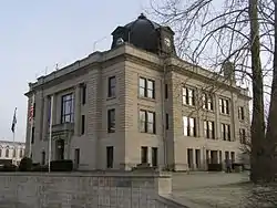 The Owen County Courthouse is a historic courthouse located at Spencer, Owen County, Indiana, United States. It was the work of Jesse Johnson and Christian Kanzler & Son and built in 1910–1911. It is a three-story, with basement, Classical Revival style limestone building. The flat roof is topped by a copper dome with four-sided Seth Thomas clock.[2]:5