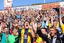 Oxford led the table for most of the first half of the 2009–10 season, but dropped into the play-off places after a poor run of form, finishing third. They beat Rushden & Diamonds over two legs to advance to the play-off final against York City on 16 May 2010.[68] Oxford won the final 3–1, to return to the Football League for the 2010–11 season.[69] The attendance was 42,669,[70] a new record for the final, with around 33,000 being United fans.