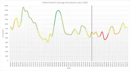 The club have a number of celebrity supporters, including Richard Branson,[123] Timmy Mallett,[124] Tim Henman[125] and Jim Rosenthal.[126] The club's mascot is Ollie the Ox.[127] United were the best-supported club in the Conference National before Luton Town joined the division,[128][129] and the home match between Oxford and Luton, which drew a crowd of 10,600, was used to highlight the passion for English football during the 2018 World Cup bid.[130] In 2009, a "12th man fund" was set up by a group of supporters in order to provide additional transfer funds to the club. As a result, the number 12 shirt was retired at the start of the 2009–10 season (though it was reintroduced in 2018–19). The fund raised over £40,000 and resulted in the signings of Mehdi Kerrouche (on loan) and Jamie Cook, amongst others.[131][132]