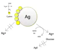 Silver is stable in water and needs an oxidizing element to achieve oxidative dissolution. When oxidizing agents such as hydrogen peroxide or oxygen are present, they dissolute AgNPs to release Ag+. The release of Ag+ leads to creation of reactive oxygen species (ROS) inside cells, which can further dissolute the nanoparticles. Some nano silver particles develop protective Ag3OH surface groups [1] and it is thought that dissolution removes these groups and forms oxygen radicals, which attenuate reactivity of the AgNPs by entering into the lattice to form a highly stable Ag6O octahedral structure.[1] It has been thought AgNP efficacy can mainly be attributed to shape, as nanoprisms and naorods have proven more active than nanospheres because they possess more highly exposed facets, thus leading to a faster release of Ag+ ions.
