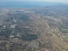 This plain has been formed chiefly by the deposition of sediments from Santa Clara River and Calleguas Creek.[6] This plain contained a series of marshes, salt flats, sloughs, and lagoons prior to the expansion of agriculture. The Santa Clara River is one of the largest river systems along the coast of Southern California and only one of two remaining river systems in the region that remain in their natural states.[7] The Oxnard Plain faces the Santa Barbara Channel portion of the Southern California Bight, extending from the abrupt transition of the steep rocky shore at Point Mugu in the Santa Monica Mountains on the south to the Ventura River on the north.[8] Prominent on the southeastern horizon are Conejo Mountain and Boney Peak.