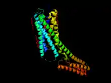 P2Y receptors are membrane proteins belonging to the class A family of G protein-coupled receptors (GPCRs).[6][7] P2Y receptor proteins display large-scale structural domains typical of GPCRs, consisting of seven hydrophobic transmembrane helices connected by three short extracellular loops and three variably sized intracellular loops; an extracellular N-terminus; and an intracellular C-terminus.[8] The extracellular regions interact with the receptor ligands, while the intracellular regions activate the G protein,control receptor internalization, and mediate dimerization.[7] Similar to other GPCRs, P2Y receptors can form both homodimers and heterodimers. These dimeric forms may vary significantly in their biochemical and pharmacological properties from the monomeric receptor.