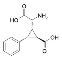 - Pellicciari R, Marinozzi M, Natalini B, Costantino G, Luneia R, Giorgi G, Moroni F, Thomsen C (May 1996). "Synthesis and pharmacological characterization of all sixteen stereoisomers of 2-(2'-carboxy-3'-phenylcyclopropyl)glycine. Focus on (2S,1'S,2'S,3'R)-2-(2'-carboxy-3'-phenylcyclopropyl)glycine, a novel and selective group II metabotropic glutamate receptors antagonist". Journal of Medicinal Chemistry. 39 (11): 2259–69. doi:10.1021/jm960059+. PMID 8667369.