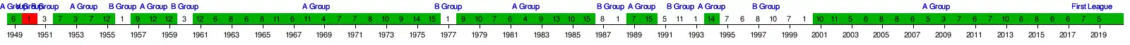 | 2001–02 | A Group | 11 | 40 | 12 | 11 | 17 | 47 | 51 | 35* | Round of 16 | Relegation Group |