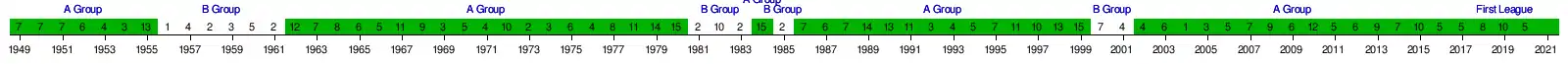 | 2013–14 | A Group | 7 | 38 | 15 | 5 | 18 | 49 | -6 | 50 | Semi-finals | |