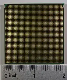 Each core has a 64 KB, four-way set-associative instruction cache and a 64 KB data cache of an eight-way set-associative design with a two-stage pipeline supporting two independent 32-bit reads or one 64-bit write per cycle.[9] Each core has semi-private 4 MiB unified L2 cache, where the cache is assigned a specific core, but the other has a fast access to it. The two cores share a 32 MiB L3 cache which is off die, using an 80 GB/s bus.[10]
