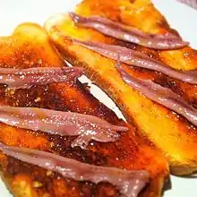 Pa amb tomàquet (Catalan pronunciation: [ˈpam tuˈmakət]), or Pan con tomate in spanish ("Bread with tomato"), is a traditional food of Catalan, Valencian, Aragonese, Balearic and Murcian cuisines in Spain. Pa amb tomàquet is considered a staple of Catalan cuisine and identity. While considered a signature toast dish in Catalonia, it is common in bars throughout the rest of Spain, where it is also known either as pan con tomate or as pan tumaca.[1][2]