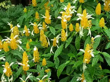 Pachystachys lutea, known by the common names lollipop plant and golden shrimp plant, is a subtropical, soft-stemmed evergreen shrub between 36 and 48 inches (90 and 120 cm) tall. The zygomorphic, long-throated, short-lived white flowers emerge sequentially from overlapping bright yellow bracts on racemes that are produced throughout the warm months. It is a popular landscape plant in tropical and subtropical areas of the world.[1]