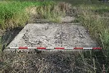 Kitchen chimney and boiler base (N concrete slab) of former Pacific Islander Hospital building, from west, 2017 - The south-eastern chimney base (hospital building) comprises a 2.16 metres (7 ft 1 in) (east-west) x 1.72 metres (5 ft 8 in) (north-south) concrete slab, with surface traces of mortar and brick. Freshly broken pieces of concrete from the southwest corner of the slab indicate the possible use of heavy machinery in clearing the site.[1]