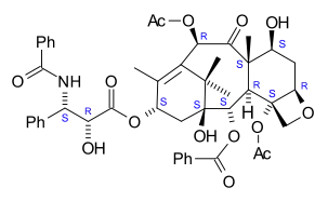 The nomenclature for paclitaxel is structured on a tetracyclic 17-atom skeleton. There are a total of 11 stereocenters. The active stereoisomer is (−)-paclitaxel (shown here).