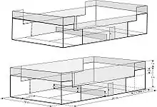 Glass panels make up the back walls and service side walls (closest 2 side panels to back walls), whilst metal mesh panels occupy the sides.[9]