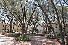 Padua Hills was a 2,000-acre tract of land directed by Bess Garner and Herman Garner. It was subdivided into a 6-acre artist colony called the Little Theater Association with a central dining room, artist studio, shops, and a small theatre. Located three miles north of Foothill Boulevard in the City of Claremont, the Spanish Revival buildings were nestled at the base of the mountains and surrounded by lush trees and shrubs. As described by the National Register of Historic Places, "The complex is situated on six acres of land and includes three buildings--a theater and restaurant building, an adjacent apartment, and a studio/residence--grouped around a central courtyard. The landscaping of olive trees and rock walls and curbing, along with an outdoor stage structure are contributing site features. A 'Padua Hills Theatre' sign with a pair of Mexican folk dancers and a life-sized statue of an Indian maiden add to the mood of the setting."[3] The theatre was operated by the Padua Institute, a non-profit educational corporation. Offering courses in Mexican folk music, dance, and Spanish, the institute was advertised for its work in preserving the Spanish and Mexican heritage of early California.[4]