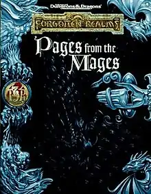 Pages from the Mages was the 8th prestige-format "FOR" (Forgotten Realms) sourcebook published between 1990 and 1995, however, it did not have a module code and it was the first in the series that did not have the traditional black-bordered gloss-on-matte cover.[2] Pages from the Mages was a soft-bound volume published by TSR.[1] It was designed by Ed Greenwood and Tim Beach, and was published in 1995. The cover design was by Renee Ciske, black and white art by Valerie Valusek and interior four color art by Ned Dameron and Erik Olson.