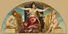 Munkácsy's Apotheosis of the Renaissance seems like a building of the Renaissance with a dome, which is opened to the sky. In a loggia one can see the pope, below Michelangelo, Leonardo da Vinci and Raphael. Tizian gives lessons in painting, and Paolo Veronese stands on a framework. Personalized representations of fame and glory of the arts hover above - Pheme and Glory.
