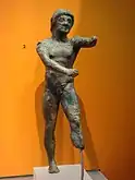 In separate cases in the middle of room 9 of the Archaeological Museum of Delphi are exhibited three bronze statuettes. One is a Corinthian figurine of a man wearing himation and playing the double flute (460–450 B.C.) and two represent a pair of naked athletes, dating to the same period but originating from Attica. One of the athletes holds a jumping weight and a wreath or stlengis. These figurines constitute a proof of the Pythian Games, both athletic and musical, which took place in Delphi every four years.[1]