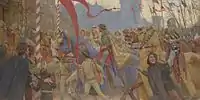 The public and many art critics directed their attention to the young painter, and in 1883 he signed a contract with the "French" gallery in London.[10] He continued his travelling through Caucasus,[11] Morocco, Egypt,[11] Greece, Turkey, Italy, and Spain.[12] A great number of sketches, notes, and studies, along with the collected objects from the life of the common people, will find their place in his famous genre-compositions, such as: Fencing, Decorating of the Bride, and Cockfighting. Some of Jovanović's most remarkable praises were gathered at two of his greatest exhibitions: Millennium exhibition in Budapest in 1896, where he prepared Migration of the Serbs for entry, but the Vršac triptych was sent instead, and the World Exhibition in Paris in 1900, for which he had painted a great historical composition The Proclamation of Dušan's Law Codex.
