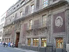 This Mexican Baroque building was designed and begun by Francisco Antonio Guerrero y Torres and finished by his brother-in-law Agustín Duran between 1779 and 1785.[1][5] The building has three floors and a mezzanine, showing Italian influence in its Baroque design. Its façade of tezontle and cantera stone[6] is flanked by two fortified towers at the ends of the façade. It has a central gallery or loggia, which is now closed to the public. The façade is decorated with carved stone that features organic and geometric motifs such as flowers, small double-tailed mermaids and graceful male figures. Inside, the porch has a vaulted roof.[1]