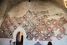 These marble pieces were brought to Anagni from 1720 onwards and incorporated into the pavement and along the walls of the Sisters’ church. The initiative came from Marcantonio Boldetti and Giovanni Marangoni, both involved in the foundation of the Cistercian Sisters of Charity, and both official overseers of the Roman catacombs in the years 1700-1753. In the early years of the twentieth century the slabs were moved once more and located as at present on the instruction of the Bishop of Anagni, Antonino Sardi (1849-1917).
