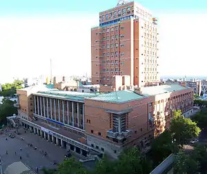In front of the main entrance is an impressive bronze replica of David of Michelangelo. The atrium of the building hosts exhibitions of art, craft and varied cultural expressions, while on the right side there is a copy of the statue of Nike of Samothrace. The west wing of the building hosts the Museum of History of Art. The Municipal centre of Photography includes the Photographic Archive of Montevideo, which is a service where the public can acquire copies from the material of the archive.[3] On the back side of the building, there is an external elevator taking the public to floor 22 of the building where there is a city observatory. Also on the back of the building is the Direccion de Necropolis which supervises the cemeteries of the city.