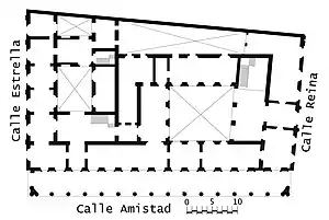 The first house was designed by José Manuel Carrerá, an architect of Dominican origin and is linked to all his companies and the projects of the Alfonso family, which was his wife's, especially the railway network that both deployed in the province of Matanzas. The influence of Don Domingo Aldama is revealed in the fact that in order to authorize him to construct the Palace, the Spanish authorities repealed an order prohibiting civil constructions in the military zone; that is, adjacent to the Campo de Marte, although the Palace's front elevation was required to face that space. Las Cuevas Toraya notes that it is a masonry house, even the interior partitions, and draws attention to the main staircase, built with Carrara marble blocks, the treads are adjusted to each other without any added external support.[5] The building has a dining room that was designed for more than one hundred people. The arcade has a height of two floors, covering the ground floor and the mezzanine. An upper deck is supported by the capital decorations, typical of neoclassical constructions, although it has some elements of the late Baroque[lower-alpha 3] and the Renaissance.