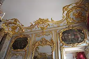 The red canopy bed in the King's bedchamber is a 1989 copy of a bed kept in the Château d'Azay-le-Rideau, thought to be very similar to the lost original.[68] The portraits of kings Louis XIV and Louis XV of France in the library are copies made in 1950 of originals by Hyacinthe Rigaud kept in the Palace of Versailles. These 20th-century copies are replacements for the 18th-century copies of the same paintings that were destroyed during the French Revolution at the same time as the portraits of the prince-bishops in the Bishops' Hall (see above, History).[69] The overdoor paintings in the antechamber of the prince-bishop are also 20th-century copies, replacing 18th-century copies of French Baroque masters such as Antoine Coypel, Charles Le Brun, and Charles de La Fosse, that were destroyed in 1944. These paintings represent biblical stories; the lost first copies were made in 1737–1740 in Versailles.[70] The other paintings on the walls belong to the Musée des beaux-arts, including Louis XV offrant la Paix à L'Europe ("Louis XV presenting Peace to Europe", 1737) by François Lemoyne, on display in the Garde-robe du prince-évêque,[71] and La déification d'Énée ("The Deification of Aeneas", 1749) by Jean II Restout, on display in the Chambre du prince-évêque.[72]