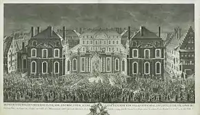 The House of Rohan owned[N 2] the palace until the French Revolution, when it was confiscated, declared bien national ("state owned"), and finally auctioned off on 8 August 1791.[18] Bought by the municipality, it became the new town hall (hôtel de ville) the same year, succeeding the Neubau. Much of the furniture and many of the works of art in the Palais were sold, and in 1793 the eight life-sized mural portraits of prince-bishops decorating the Salle des évêques (Bishops' Hall) were destroyed. They were replaced in 1796 by allegories of civic virtues painted by Joseph Melling.[19] Only the portrait of Armand Gaston, the builder of the palace, was later restored to its original place with a 1982 replica of Hyacinthe Rigaud's lost painting.[N 3] Melling also replaced the overdoor portraits of kings of France, decorating the same room with paintings of vases.[19][21]