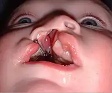 A palatal plate is a prosthetic device, generally consisting of an acrylic plate and retention clasps of orthodontic wire, which covers a fistula of the palate. It may be used to aid in improving articulation and feeding. The blockage of the opening helps improve hypernasality and suckling ability for babies. In the case of a labial-oral-nasal fistula, the plate may include an anterior upward extension to fully occlude the passageway running between the labial surface of the alveolus, alveolus, and nasal cavity. The plate may be constructed to include any congenitally missing teeth to improve articulation and appearance. Individuals who use palatal plates must be monitored periodically by their dental professionals due to possible tissue irritation by the plate. Materials such as food particles, oral mucosa and secretions may cause buildup on the upper surface of the plate; therefore, it is essential to clean a palatal obturator at least twice a day to avoid tissue irritation. There are also more specific terms used for obturators depending on their time and purpose of use: Photo Examples of the Latham Device or the Nasal Alveolar are prime examples for use in Cleft Palate Deformities.