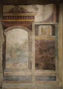 In 2006, archaeologists announced the discovery of the Palatine House, believed to be the birthplace of Rome's first Emperor, Augustus.[16] A section of corridor and other fragments under the Hill were found and described as "a very ancient aristocratic house." The two-story house appears to have been built around an atrium, with frescoed walls and mosaic flooring, and is situated on the slope of the Palatine that overlooks the Colosseum and the Arch of Constantine. The Republican-era houses on the Palatine were overbuilt by later palaces after the Great Fire of Rome (AD 64), but apparently this one was not and perhaps was preserved for an important reason. On the ground floor, three shops opened onto the Via Sacra. The location of the domus is significant because of its potential proximity to the Curiae Veteres, the earliest shrine of the curies of Rome.[17]