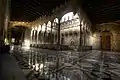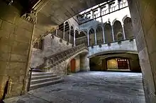 The current structure actually predates its use as a governmental headquarters, and had to be adapted to its new functions with constructions and renovations from the early 15th century to the mid-17th century. It has Gothic elements, such as its central courtyard with a grand staircase and galleries surrounding it. The original façade of the building, facing the Carrer del Bisbe, was also built in the flamboyant Gothic style, as was the chapel of Sant Jordi. The building's present main façade was built in the Renaissance, and it faces the Plaça de Sant Jaume.[1] The four dark granite columns of the main entrance were originally sculpted in Troy and brought first, together with 45 more, to Tarragona on the occasion of Emperor Hadrian's stay in the city, which took place during the winter of 122-123 DC.[2] Between 1610 and 1630, Pere Ferrer and his son Pere Pau Ferrer carried out the work on the façades on Carrer Sant Honorat and on Carrer Sant Sever. They also constructed a new gate on Carrer Bisbe in the Vignolesc style, similar to the one on the Carrer de Sant Sever.[3]