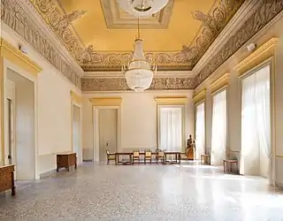 The Hall of Honor, which is located on the first floor, has access to the loggia that faces the Arena Civica.[10] At the entrance of the Hall of Honor there are paved mosaics with classic motif, rosettes, meandering bands, and layered surfaces, designed by Luigi Canonica and inspired by strict Classicalism. At the central entrance, which was designed by the house of C. Fabricio as evidenced by the signature, the central rosette, which once decorated the entrance, was replaced in 1928 with the coat of arms of Milan, which was granted jurisdiction over the entire arena in 1870.[3] The creators' names of the mosaics are readable between the mosaic tiles, including the firms Fabricio and Fantini. The latter also worked on other buildings close to the Palazzina in the 1830s. The mosaic shows differences from the original project and it has recently been subjected to a major conservative restoration on its entire surface where grafts of new plugs and mortars to fill the damaged plugs are visible.