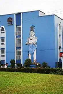 The name Palenque comes from Spanish and means “wood stake fence.” It is a literal translation of the Ch’ol word “otulún” which means fenced or fortified place.[3] The modern town was founded by Friar Pedro Lorenzo near the ruins of the same name in 1567. It was founded to congregate the Ch’ol indigenous families that were dispersed in this part of the Lacadon rainforest. In 1768, the state of Chiapas was divided into “alcaldía mayores” with Palenque belonging to that of Ciudad Real (San Cristóbal de las Casas). In 1813, the settlement was officially declared a town. In 1821, a road between Bachajon and Palenque was constructed, and the town's first school was established in 1828. In 1847, the area became part of the department of Tila. Two year later it was made into its own department. The annual fair of Santo Domingo (Saint Dominic) was authorized in 1877. In 1883, the state was reorganized into twelve departments with Palenque as head of one of them. A railroad connecting the town with the Gulf of Mexico was constructed at this time, with the Pakalna station, which still exists. The municipality system was created in the state in 1915, with Palenque head of its own municipality. The first airfield was established in 1931 and mail and telegraph arrived in 1941. In 1972 it was declared a city by the governor of the state of Chiapas. The Casa de Cultura was founded in 1980 with the main road paved in 1990. The Cecytec technical college was founded in 1994. The modern airport was created in 1997.[3]
