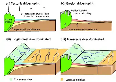 Erosion driven uplift results in transverse rivers dominating the area instead of longitudinal rivers. During active erosion and isostatic rebound, accommodation space is reduced quickly and continually, while sedimentation rate is also high. Therefore, transverse rivers developed on the uplifted mountain range are able to extend way beyond the foot of the mountain range. Longitudinal rivers only dominate distal parts of the drainage basin.[40]