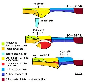 Later, magmatic activity ceased as the continent collision occurred. Denser materials in the Indian and Asian continental crust sank to the bottom part of the crust, making the lower crust extremely dense and heavy. It thus broke off and sank into the mantle. The removal of the dense lower crust reduced gravitational pull on the Lhasa block and allowed it to rise (30—26 Ma).[26] Together with the intense compressional force and thrusting it experienced amidst collision, intense crustal thickening occurred, resulting in the major phase of uplift in South Tibet. As the collision proceed (26—13 Ma), the Northern Tibet continental block experienced compression, thrusting and shortening as well.[26] This interpretation is supported by the thermochronological data of apatite fission tracks from the North Tibetan Plateau, which indicate phases of rapid exhumation and compression from 20 Ma onwards.[33][34]