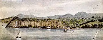 In 1800 the population of Palisades was 114.[1] Because of the local topography the town was well suited to become a river center. Rising from the west bank of the Hudson River, the Palisades Cliff forms an obstacle to transport seeking access to the river. A break in the terrain occurs at Palisades, still known as Snedens Landing in the early 19th century, where the landscape is rugged but not precipitous. It afforded New Jersey farmers the opportunity to bring their produce down Washington Springs Road to the river, where they could ship it across to the east side of the Hudson and continue down to New York City. Also, at this time the city created a demand for quarried stones for use in paving streets and building houses. According to tradition, the stones cut from the Palisades Cliff paved many New York City streets, including Broadway.[7] Snedens Landing provided these farmers and quarrymen with the first access for a stretch of about 13 miles above Burdetts Landing, or roughly the spot where the George Washington Bridge connects New Jersey and New York today. The town became so busy that a 500-foot pier was constructed.[8] In the first half of the 19th century steamboats began plying the Hudson. The Sneden family, which continued to ferry passengers and goods across to Dobbs Ferry, also communicated with steamboat traffic, which could not dock in the shallow water at the shore, mid-river.[1][8]