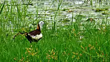 The heterogeneous ecosystem of the marshland supports about 337 species of floras and faunas.[13] Of the faunal groups, birds, fishes and reptiles are the most prominent. Pallikaranai marsh is home to 115 species of birds, 10 species of mammals, 21 species of reptiles, 10 species of amphibians, 46 species of fishes, 9 species of molluscans, 5 species of crustaceans, and 7 species of butterflies. About 114 species of plants are found in the wetland including 29 species of grass. These plant species include some exotic floating vegetation such as water hyacinth and water lettuce, which are less extensive now and highly localised.[1] The region has a bird bio-diversity about 4 times that of Vedanthangal. It is also home to some of the most endangered reptiles such as the Russell's viper and birds such as the glossy ibis, grey-headed lapwings[14] and pheasant-tailed jacana. Cormorants, darters, herons, egrets, open-billed storks, spoonbills, white ibis, little grebe, Indian moorhen, black-winged stilts, purple moorhens, warblers, coots and dabchicks have been spotted in large numbers in the marshland.[15][16] The marsh has also had the distinction of new records of reptiles and plants being described, on a rather regular basis since 2002.[17]