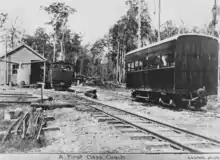 The Palmwoods-Buderim Tramway began operations in December 1914 and provided the impetus for substantial settlement expansion and economic growth in the Buderim area. It was constructed as a "private" tramway, and continued to operate until August 1935. The length of the line was seven miles fifteen chains (11.6 km), which ran from the Palmwoods railway station across undulating country to Forest Glen on the Bruce Highway, and then climbed to the top of Buderim Mountain.[1]