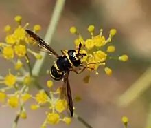 In zoology, a palynivore /pəˈlɪnəvɔːɹ/, meaning "pollen eater" (from Greek παλύνω palunō, "strew, sprinkle", and Latin, vorare, meaning "to devour") is an herbivorous animal which selectively eats the nutrient-rich pollen produced by angiosperms and gymnosperms.[1] Most true palynivores are insects or mites. The category in its strictest application includes most bees, and a few kinds of wasps,[2] as pollen is often the only solid food consumed by all life stages in these insects. However, the category can be extended to include more diverse species. For example, palynivorous mites and thrips typically feed on the liquid content of the pollen grains without actually consuming the exine, or the solid portion of the grain. Additionally, the list is expanded greatly if one takes into consideration species where either the larval or adult stage feeds on pollen, but not both. There are other wasps which are in this category, as well as many beetles,[3] flies, butterflies, and moths. One such example of a bee species that only consumes pollen in its larval stage is the Apis mellifera carnica.[4] There is a vast array of insects that will feed opportunistically on pollen, as will various birds, orb-weaving spiders[5] and other nectarivores.