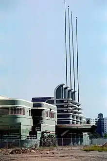 Built by event promoters Phillip and Cliff Henderson[1] and designed by Los Angeles architects Wurdeman & Becket, the Pan-Pacific Auditorium opened to a fanfare of Boy Scout bugles on May 18, 1935 for a 16-day model home exhibition. Noted as one of the finest examples of Streamline Moderne architecture in the United States, the green and white facade faced west, was 228 feet (69 m) long and had four stylized towers and flagpoles meant to evoke upswept aircraft fins. The widely known and much photographed facade belied a modest rectilinear wooden structure resembling an overgrown gymnasium inside and out. The auditorium sprawled across 100,000 square feet (9,300 m2) and had seating for up to 6,000.[2]