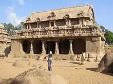 According to a plaque displayed at the site by the ASI, the Pallava dynasty had planned the structures as models of chariots in rock based on prototypes of ancient rathas built in wood.[8] The Pancha Rathas were carved during the reign of King Mahendravarman I and his son Narasimhavarman I. Work on these five rathas was discontinued following the death of Narasimha Varman in 668 AD.[4][9] The purpose of their construction is not known as the structures were not completed. Part of the collection within the Group of Monuments at Mahabalipuram, they were classified as a UNESCO World Heritage Site in 1984.[2]