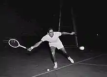Gonzales didn't play on the pro circuit at all in 1962. His only appearance in 1963 was at the United States Professional Championship, which were held that year at the hallowed Forest Hills courts. Gonzales both dismayed and infuriated his colleagues by being the only player who was paid for his participation. Having learned by bitter experience about the exigencies of the pro tour, Gonzales had demanded, and received, $5,000 in advance for his appearance in the tournament.[95] An out-of-shape, semi-retired Gonzales was beaten in the first round by Alex Olmedo.[96] Ken Rosewall eventually beat Rod Laver in the finals but neither of them collected a penny: the promoter had failed to obtain a television contract, could not meet his costs and couldn't pay any prize money to any of the players.[97]